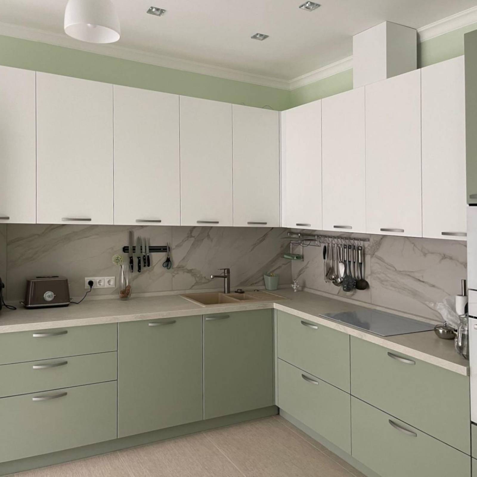 • Белый. Еще один компаньон для оливкового. Этот микс – одно из наиболее ярких сочетаний, придающих интерьеру свежести и актуальности. Сочетание этих двух цветов возможно как в равных долях, так и с преобладанием одного из оттенков. К примеру, в интерьере отлично сочетаются белоснежная столешница, светлый фартук или стены с нежно-фисташковой мебелью.